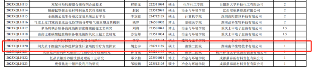 近日,中南大學研究生院公示了2023年度中南大學研究生校企聯(lián)合創(chuàng)新項目(第二批)擬立項項目。南華生物醫(yī)藥股份有限公司子公司湖南南華生物技術有限公司與中南大學湘雅二醫(yī)院合作課題《間充質(zhì)干細胞外泌體緩解急性肝衰竭的治療方案探索》成功立項。